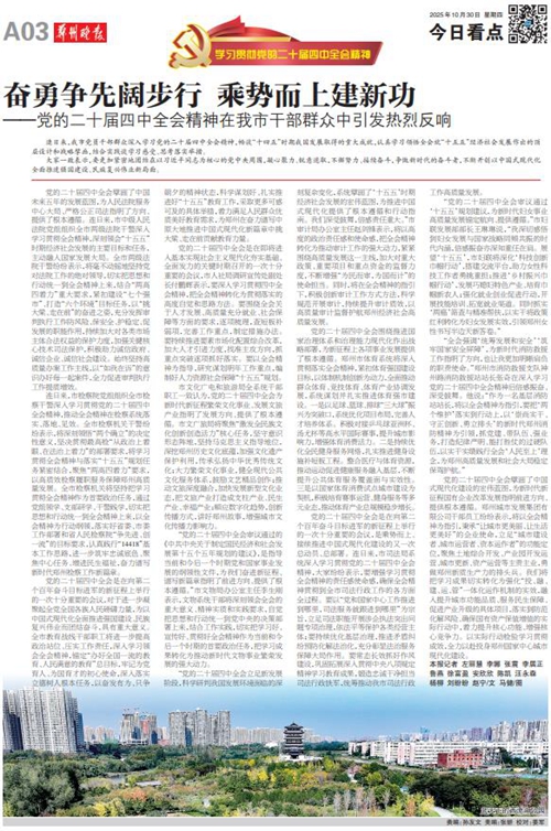 黨的二十屆四中全會(huì)擘畫了中國(guó)式現(xiàn)代化建設(shè)的宏偉藍(lán)圖,為新時(shí)代新征程國(guó)有企業(yè)改革發(fā)展指明前進(jìn)方向、提供根本遵循,鄭州城發(fā)集團(tuán)廣大黨員干部群眾深受鼓舞、倍感振奮。近日,《鄭州日?qǐng)?bào)》《鄭州晚報(bào)》開(kāi)設(shè)了【學(xué)習(xí)貫徹黨的二十屆四中全會(huì)精神】專欄,2025年10月30日,報(bào)道了鄭州城發(fā)集團(tuán)深入學(xué)習(xí)貫徹落實(shí)黨的二十屆四中全會(huì)精神,以全會(huì)精神為指引真抓實(shí)干創(chuàng)未來(lái)。