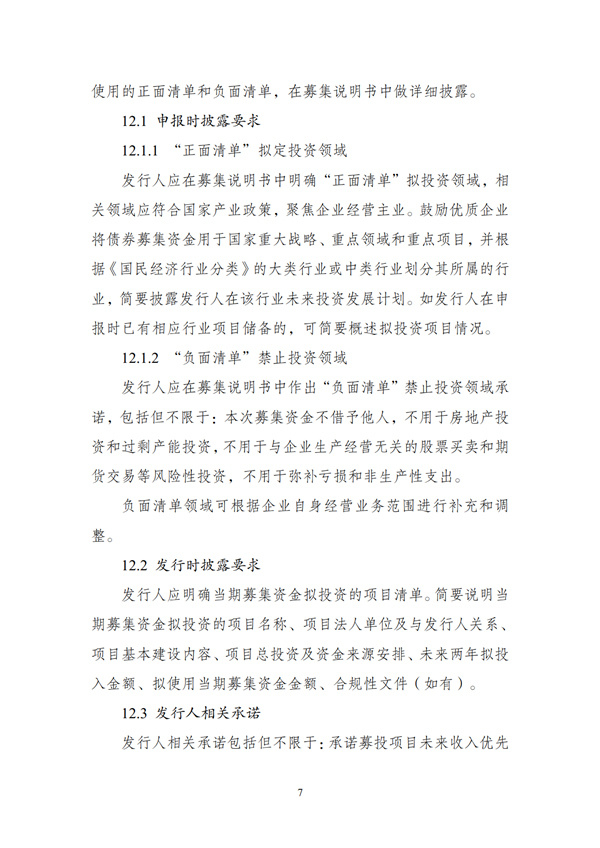 (一)申報材料應(yīng)明確債券募集資金擬投資領(lǐng)域,形成“正面清單”。“正面清單”應(yīng)符合國家產(chǎn)業(yè)政策,聚焦企業(yè)經(jīng)營主業(yè)。支持優(yōu)質(zhì)企業(yè)在“正面清單”擬定的范圍內(nèi)依法合規(guī)安排使用募集資金,提高債券資金使用效率和靈活度。