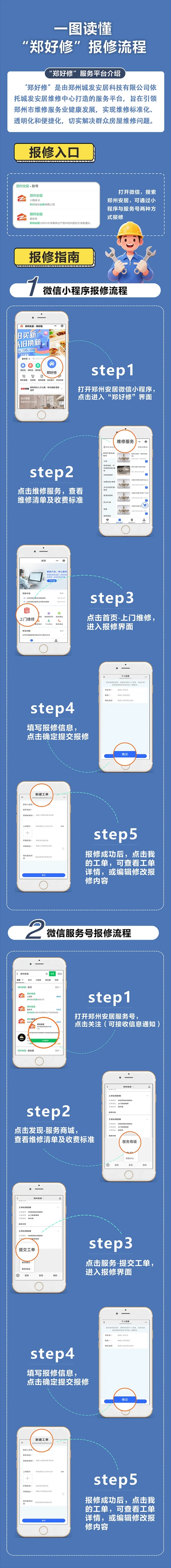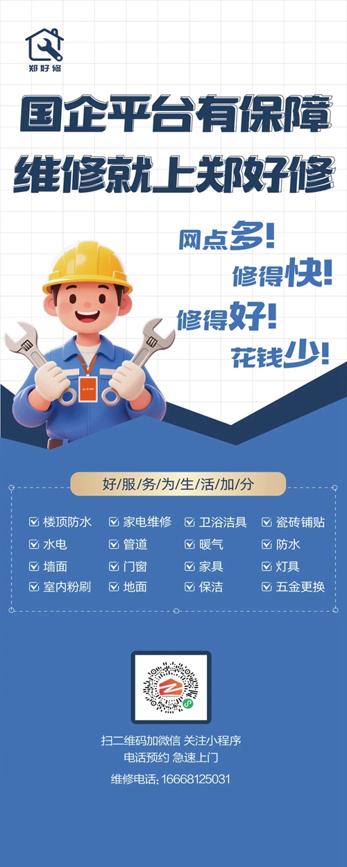 為切實解決群眾房屋維修難題,推動鄭州市維修服務業(yè)邁向標準化、透明化、便捷化發(fā)展新征程,由鄭州城發(fā)集團下屬子公司鄭州城發(fā)安居科技有限公司精心打造的“鄭好修”服務平臺,正式上線運營。市民通過鄭州安居微信小程序、鄭州安居微信服務號,即可輕松實現(xiàn)一鍵報修,享受優(yōu)質(zhì)高效的房屋維修服務。